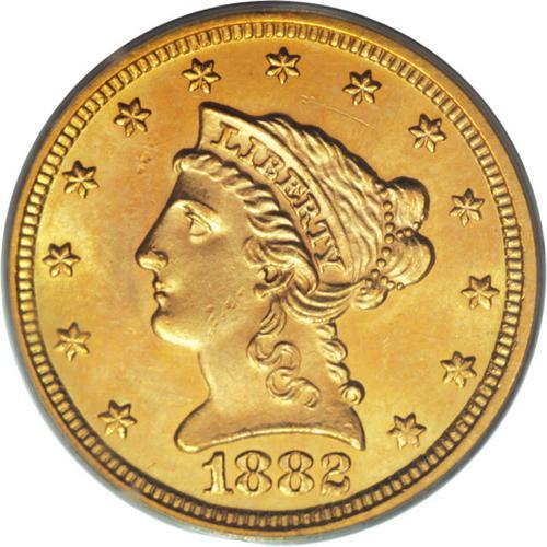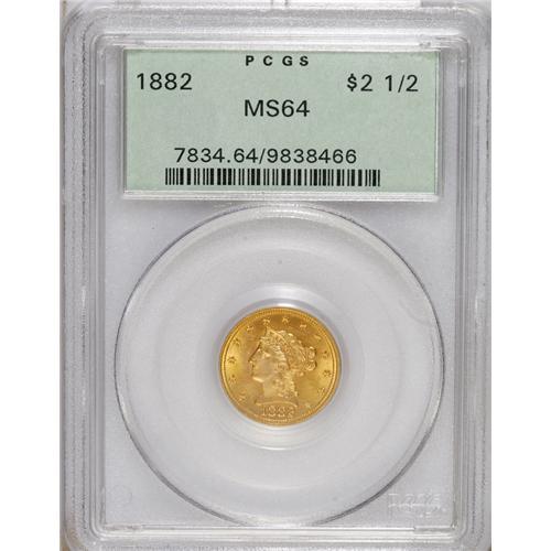<B>1882 $2 1/2 MS64 PCGS.</B></I> The 1882 has a minuscule mintage of 4,000 pieces, and fully lustrous survivors are desirable. This luminous near-Gem offers delicate peach, lilac, and lime toning. The reverse is well preserved, and the obverse has only minor marks. Encapsulated in a green label holder. Population: 13 in 64, 9 finer (2/07).<BR><BR><b>Shipping:</b> Coins & Currency (<a target="_blank" href="http://www.heritageauctions.com/common/shipping.php">view shipping information</a>)