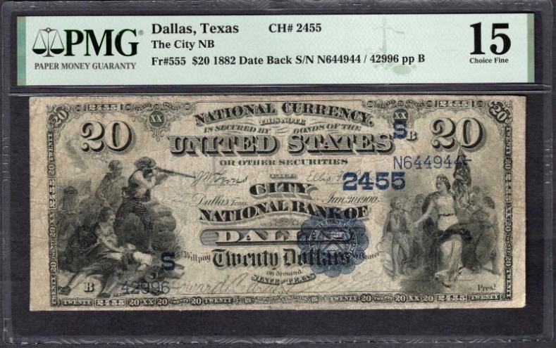 One 1882 $20 Dallas TX National PMG 15.