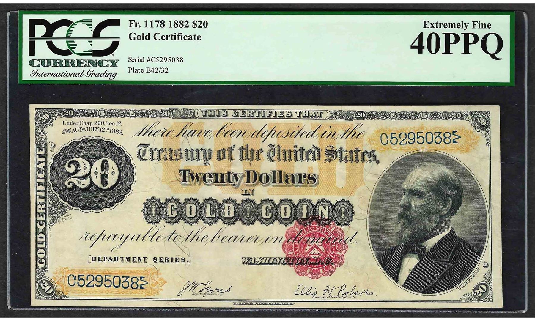 One 1882 $20 Gold Certificate Note Fr.1178 PCGS Extremely Fine 40PPQ. PCGS Graded.