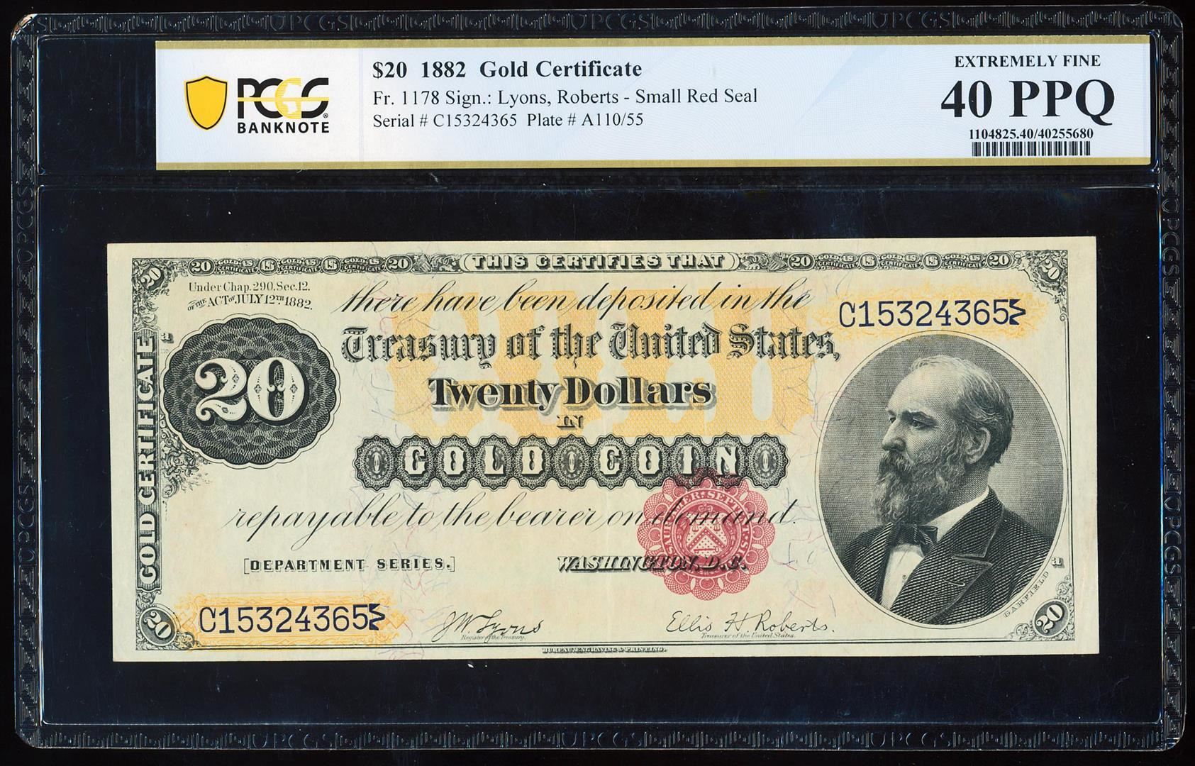 One 1882 $20 Gold Certificate Note Fr.1178 PCGS Extremely Fine 40PPQ. PCGS Graded.