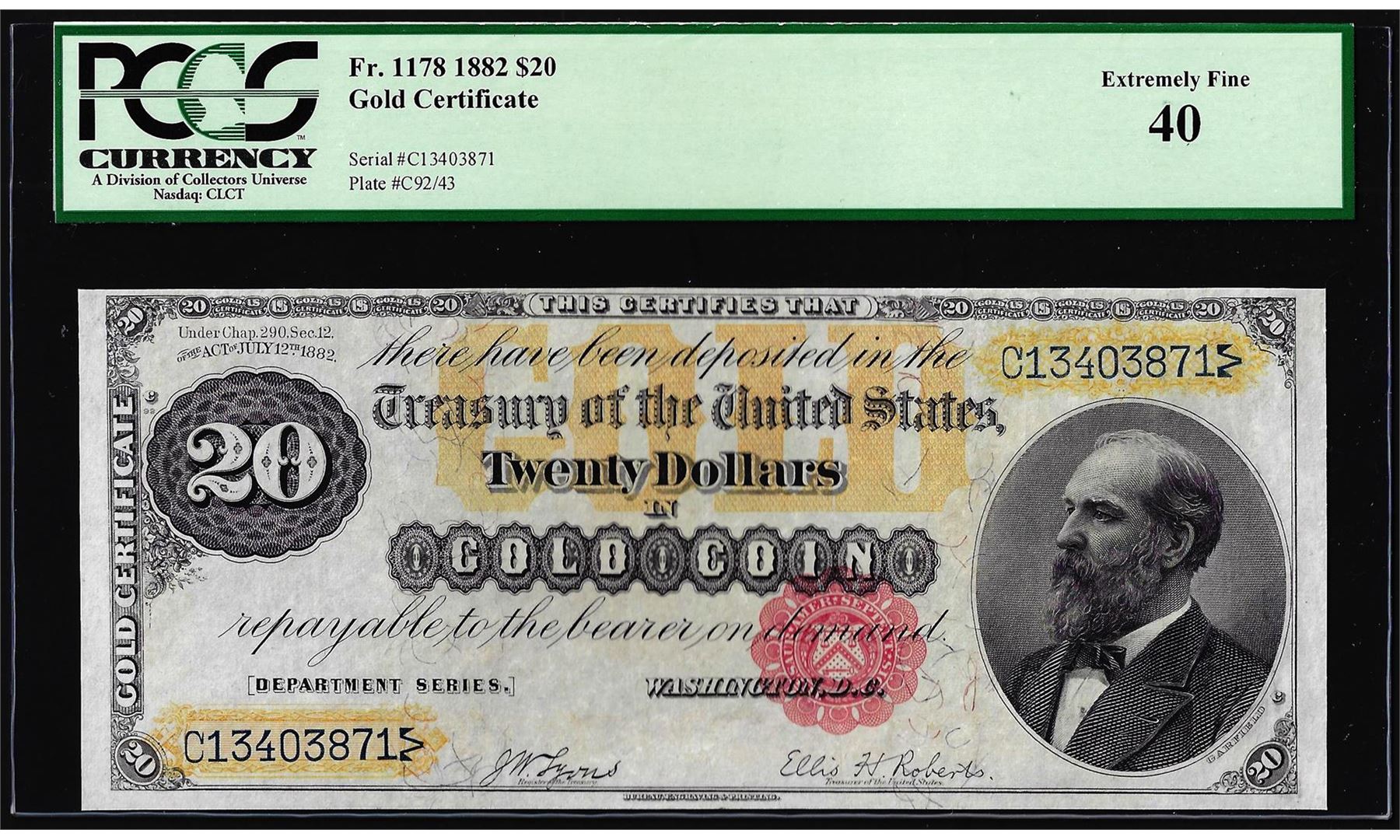 One 1882 $20 Gold Certificate Note Fr.1178 PCGS Extremely Fine 40. PCGS Graded.