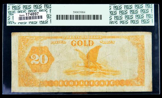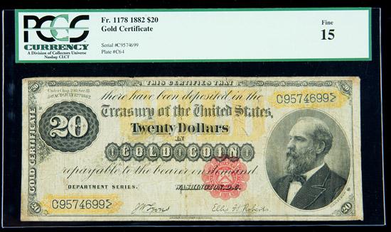 1882, $20 Gold Certificate. PCGS Fine 15. . Fr-1178. A good-looking Garfield $20 with no mentionable flaws for the grade.