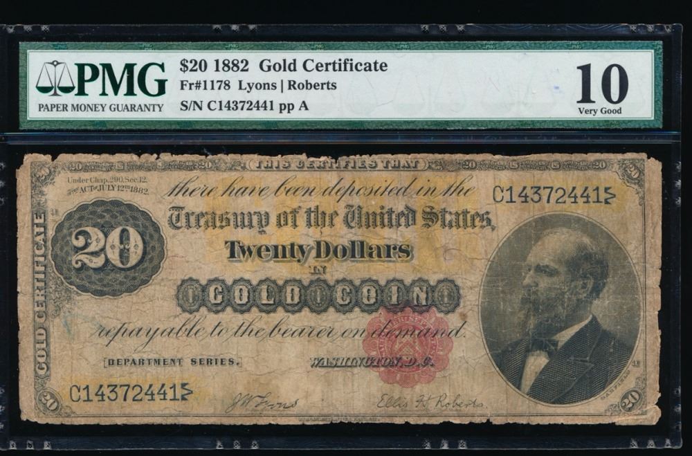 One 1882 $20 Gold Certificate PMG 10.