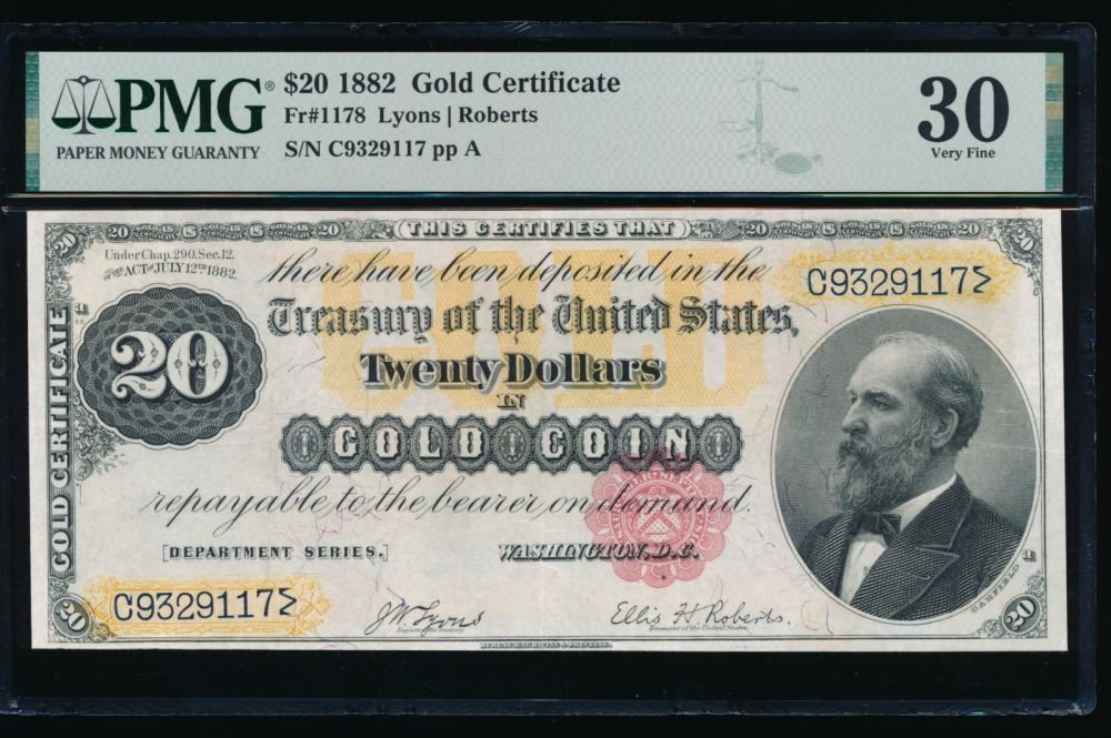 One 1882 $20 Gold Certificate PMG 30.