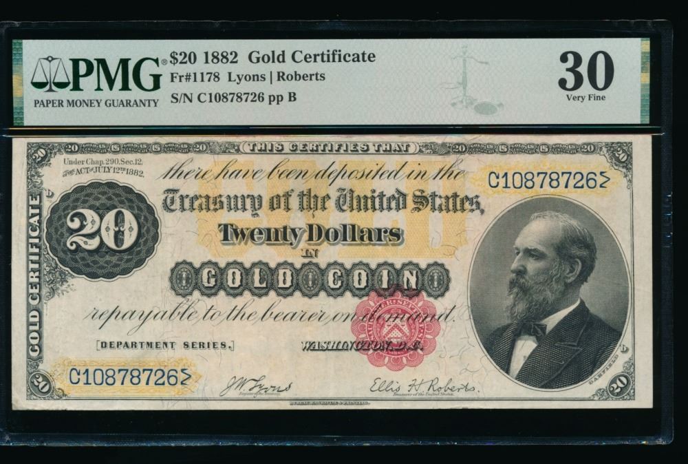 One 1882 $20 Gold Certificate PMG 30.
