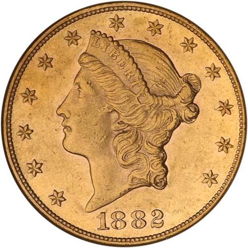 Only 571 circulation or "business strike" 1882 double eagles were made. With an estimated surviving population of 15-20 pieces in all grades, this is one of the key date Liberty $20 gold double eagles, along with the '54-O, '56-O, '70-CC, and the 1886. The true rarity of the 1882 can best be learned from the fact that Harry Bass, the grandfather of gold coin collectors of the modern era, had just one circulation strike of this date in his set and it showed signs of tooling!