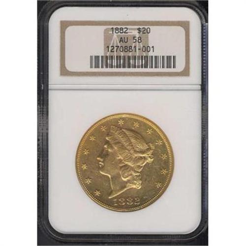 <b>1882 $20 Liberty. NGC graded AU58.</b> Frosty and immediately identifiable as a very rare circulation strike by the presence of luster and the soft, rounded appearance of the lettering (rather than the squared-off sharp detail of a circulated Proof). Proofs of this and other years are, of course, extremely rare. But for 1882 from the Philadelphia Mint, business strikes are just as desirable and also fittingly rare. The usual scattered abrasions are noted on the surfaces but none of these are deep or terribly detracting. There are probably no more than a handful AU 1882 double eagles known and this lovely AU58 is certainly among the best of these. A solid Condition Census coin that should result in serious bidding.