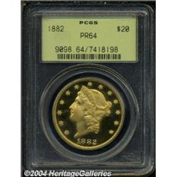 <table><tbody><tr><td><table> <TR><TD width="100%"><TABLE cellSpacing=1 cellPadding=3 width="100%" border=0><TBODY><TR><TD width="100%" bgColor=#79735c><FONT face=arial color=#ffffff size=3><B>Description</B> </FONT></TD></TR><TR><TD width="100%" bgColor=#ffffff><FONT face=arial size=2><B>1882 $20 PR64 PCGS.</B></I> The elusive 1882 Twenty Dollar, one of a mere 571 business strike produced, is ranked second in overall rarity among Liberty Double Eagle issues, behind only to the prohibitively rare 1861-P Paquet Reverse. As a result, there is heavy date pressure on the equally challenging proofs, of which just 59 coins were originally struck. The known population of surviving examples hovers at about a dozen pieces from each category, perhaps slightly exceeding that figure on the proofs. <BR>The bright, glassy mirrors on this Choice specimen are exceptionally deep, particularly when tilted away from a light, and the profoundly contrasted devices are notable for their heavy frost. Close examination reveals a cluster of tiny contact marks in the left obverse field, primarily seen in the area just in front of Liberty's mouth. The overall eye appeal is nothing short of spectacular. An important offering among proof Coronet Double Eagles. Population: 2 in 64, 3 finer (10/03).<BR><I>From a Magnificent Collection of Double Eagles.</B></I> </FONT></TD></TR></TBODY></TABLE></TD></TR></TBODY></TABLE><BR><A name=PricesRealized></A><TABLE cellSpacing=0 cellPadding=0 width="100%" bgColor=#000000 border=0><TBODY><TR><TD width="100%"><TABLE cellSpacing=1 cellPadding=3 width="100%" border=0><TBODY><TR><TD width="100%" bgColor=#79735c><A name=PR><FONT face=arial color=#ffffff size=3><B>Previous Prices from Heritage Auctions</B> </FONT></A></TD></TR><TR><TD bgColor=#f6f6ed><TABLE cellSpacing=0 cellPadding=0 width="100%" border=1><TBODY><TR><TD align=middle width="33%"><B>Date</B></TD><TD align=middle width="33%"><B>Service</B></TD><TD align=middle width="33%"><B>Price</B></TD></TR><TR bgColor=whitesmoke><TD width="33%"><B>01/01/1993</B></TD><TD width="33%">NGC</TD><TD width="33%">$44,000.00</TD></TR></TBODY></TABLE></TD></TR><TR><TD bgColor=#ffffff><FONT face=arial size=1 ?>PLEASE NOTE: All prices realized reflect the final hammer price PLUS the buyer's premium in auctions that charge a buyer's premium. Each item has a notation at the top of the listing indicating whether that lot included a buyer's premium. Example: A item that sells with a final hammer price of $100 and a 20% buyer's premium will display with a price realized of $120. All information listed is intended to be as accurate as possible, but errors are possible. Please use this guide carefully and inform us of any inaccuracies. </FONT></TD></TR></TBODY></TABLE></TD></TR></TBODY></TABLE><BR><TABLE cellSpacing=0 cellPadding=0 width="100%" bgColor=#000000 border=0><TBODY><TR><TD width="100%"><TABLE cellSpacing=1 cellPadding=3 width="100%" border=0><TBODY><TR><TD width="100%" bgColor=#79735c colSpan=6><FONT face=arial color=#ffffff size=3><B>Price Guide*</B> </FONT></TD></TR><TR bgColor=#f6f6ed><TD align=middle><B>Grade</B> </TD><TD align=middle><B>Coin World<BR>(Trends)</B> </TD><TD align=middle><B>Numismedia<BR>Retail</B> </TD><TD align=middle><B>Numismedia<BR>Wholesale</B> </TD><TD align=middle><B>Coin<BR>Universe</B> </TD><TD align=middle><B>Heritage<BR>Value Index</B> </TD></TR><TR bgColor=#ffffff><TD align=middle>63</TD><TD align=right>---</TD><TD align=right>---</TD><TD align=right>---</TD><TD align=right>$42,500.00</TD><TD align=right>$26,125.00</TD></TR><TR style="FONT-WEIGHT: bold" bgColor=#cccfdd><TD align=middle>64</TD><TD align=right>---</TD><TD align=right>---</TD><TD align=right>---</TD><TD align=right>$49,500.00</TD><TD align=right>$35,325.00</TD></TR><TR bgColor=#ffffff><TD align=middle>65</TD><TD align=right>---</TD><TD align=right>---</TD><TD align=right>$107,500.00</TD><TD align=right>---</TD><TD align=right>$67,500.00</TD></TR><TR bgColor=#ffffff><TD colSpan=6><FONT size=1>*All information listed is intended to be as accurate as possible, but errors are possible. No item may be returned or refused based on this information which is provided as a service to our customers. You should contact each pricing source directly to determine the accuracy of this information. </FONT></TD></TR></TBODY></TABLE></TD></TR></TBODY></TABLE><BR><TABLE cellSpacing=0 cellPadding=0 width="100%" bgColor=#000000 border=0><TBODY><TR><TD width="100%"><TABLE cellSpacing=1 cellPadding=3 width="100%" border=0><TBODY><TR><TD width="100%" bgColor=#79735c><FONT face=arial color=#ffffff size=3><B>Population Guide</B> </FONT></TD></TR><TR bgColor=#ffffff><TD align=middle><!-- Begin Output of Population Grid--><TABLE cellSpacing=0 cellPadding=0 width="100%" border=0><TBODY><TR><TD vAlign=center><TABLE cellSpacing=0 width="100%" border=1 cellsadding="3"><TBODY><TR><TD vAlign=center><TABLE cellSpacing=0 cellPadding=3 width="100%" border=1><TBODY><TR><TD vAlign=center align=middle bgColor=#f0f1e8 colSpan=2 <CENTER><FONT face=Arial size=2><B>PCGS Pop </B></FONT><CENTER></CENTER></TD><TD vAlign=center align=middle bgColor=#f0f1e8 colSpan=2><CENTER><FONT face=Arial size=2><B>NGC Pop</B></CENTER></FONT></TD></TR><TR><TD vAlign=center><FONT face=Arial size=2>(64)</FONT> </TD><TD vAlign=center align=right><FONT face=Arial size=2>2</FONT> </TD><TD vAlign=center><FONT face=Arial size=2>(64)</FONT> </TD><TD vAlign=center align=right><FONT face=Arial size=2>0</FONT> </TD></TR><TR><TD vAlign=center><FONT face=Arial size=2>(>64)</FONT> </TD><TD vAlign=center align=right><FONT face=Arial size=2>3</FONT> </TD><TD vAlign=center><FONT face=Arial size=2>(>64)</FONT> </TD><TD vAlign=center align=right><FONT face=Arial size=2>0</FONT> </TD></TR></TBODY></TABLE></TD></TR></TBODY></TABLE></TD></TR></TBODY></TABLE><!-- End Output of Population Grid--></TD></TR></TBODY></TABLE></TD></TR></TBODY></TABLE><BR><TABLE cellSpacing=0 cellPadding=0 width="100%" bgColor=#000000 border=0><TBODY><