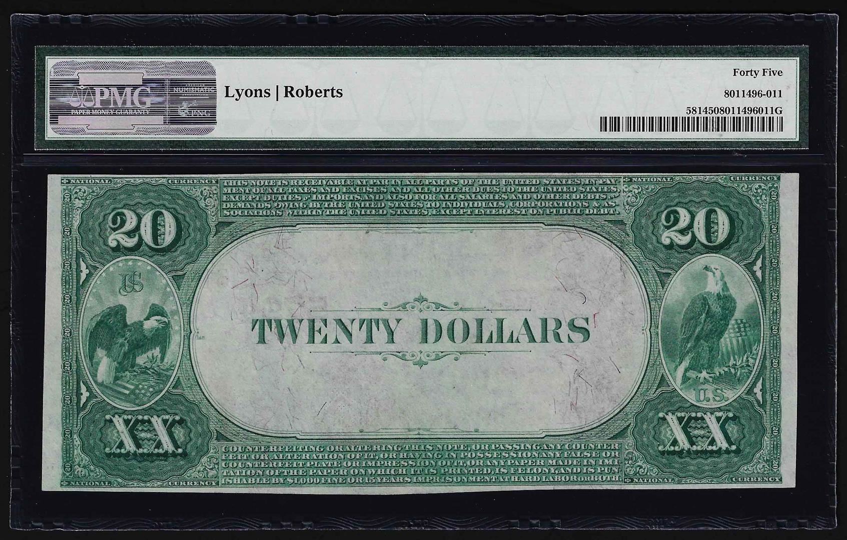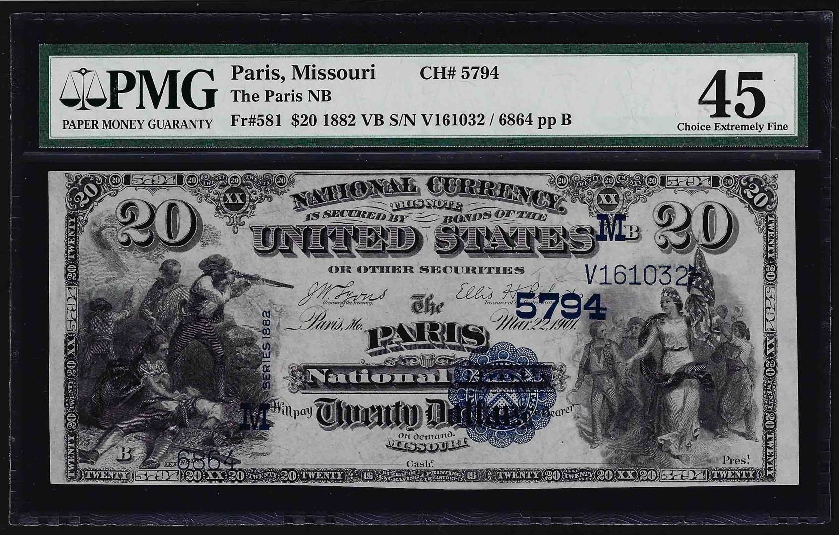 One 1882 $20 Paris Missouri National Currency Note CH# 5794 PMG Choice Extremely Fine 45. PMG Certified.