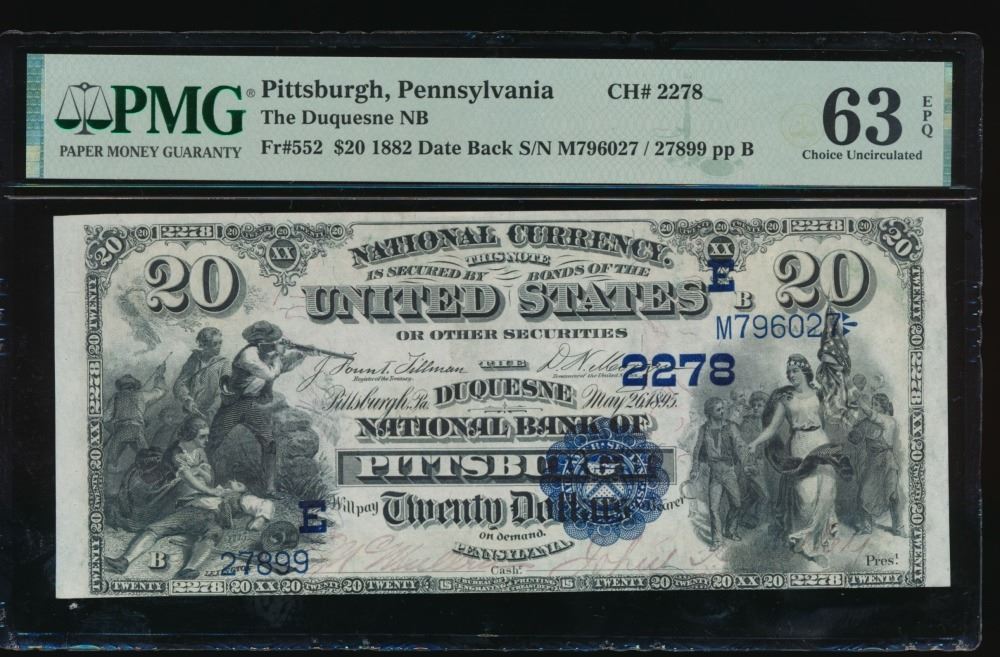 One 1882 $20 Pittsburgh PA National PMG 63EPQ.