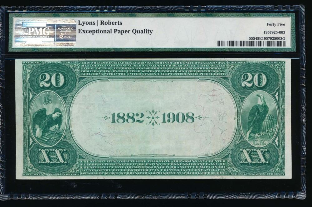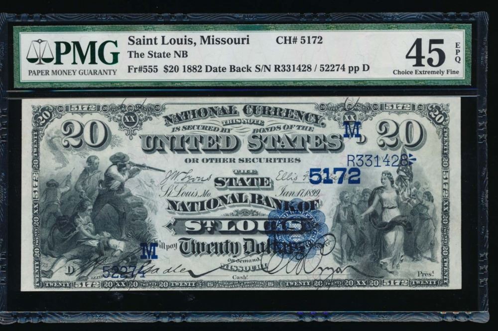 One 1882 $20 St Louis National Bank Note PMG 45EPQ.