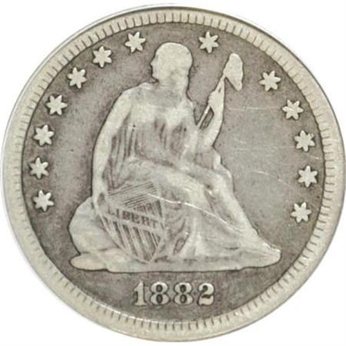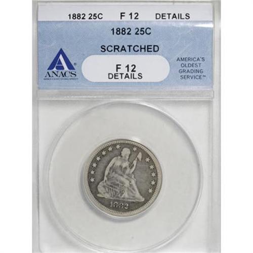 <B>1882 25C --Scratched--ANACS. F12 Details.</B></I> NGC Census: (0/60). PCGS Population (0/96). Mintage: 15,200. Numismedia Wsl. Price for NGC/PCGS coin in F12: $220. (#5514)<BR><BR><B>Coin Engraver:</B> Christian Gobrecht<BR><BR><b>Shipping:</b> Coins & Currency (<a target="_blank" href="http://www.heritageauctions.com/common/shipping.php">view shipping information</a>)