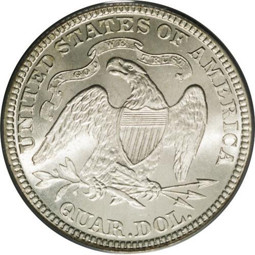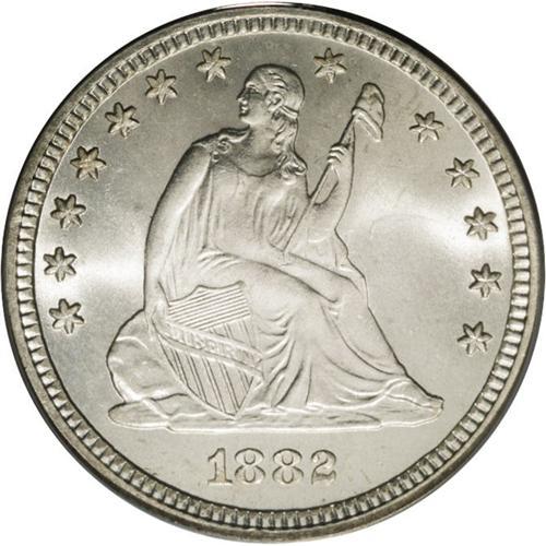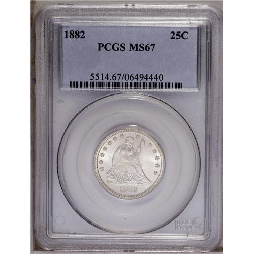 <B>1882<25C> MS67 PCGS.</B></I> We have handled more proof Seated quarters of this date than business strikes, not surprising since the original mintage of the latter production amounted to only 15,200 pieces. This Superb Gem is smooth enough to warrant consideration at an even higher grade level. The luster is no less impressive than the surface preservation, both sides being fully frosted in texture with radiant cartwheel effects. With the exception of one or two of the obverse star centrils, every feature is fully brought up. Untoned throughout with a single subtle luster graze in the right obverse field. Population: 16 in 67, 0 finer (3/06).