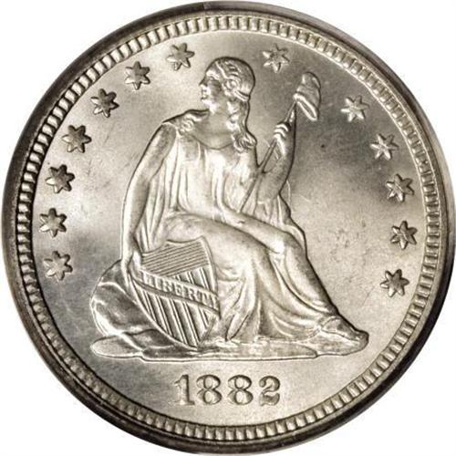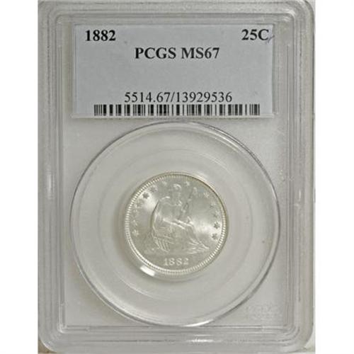 <B>1882 25C MS67 PCGS.</B></I> Most of the quarters and halves from the 1880s have low mintages. Only 15,200 pieces of the 1882 quarter were struck, and unlike many business strikes from this decade this piece shows no trace of prooflikeness in the fields. The surfaces on each side of this sharply struck coin are brilliant and heavily frosted with no obvious or distracting marks. Population: 17 in 67, 0 finer (8/07).<BR><BR><B>Coin Engraver:</B> Christian Gobrecht<BR><BR><b>Shipping:</b> Coins & Currency (<a target="_blank" href="http://www.heritageauctions.com/common/shipping.php">view shipping information</a>)