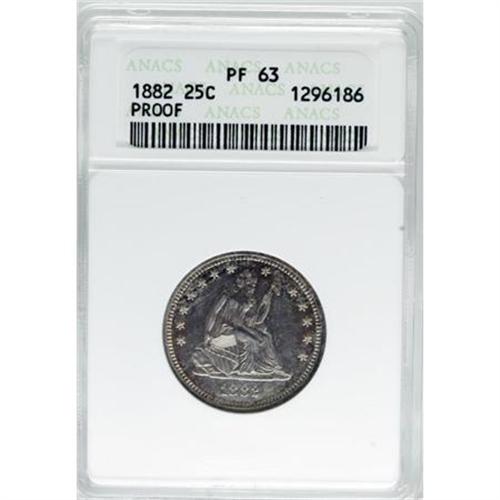 <B>1882 25C PR63 ANACS.</B></I> Bright surfaces reveal brushes of golden-brown toning, especially around the margins. The design features are exquisitely struck up, further adding to the coin's eye appeal. Some wispy hairlines are apparent in the fields.<BR><BR><b>Shipping:</b> Coins & Currency (<a target="_blank" href="http://www.heritageauctions.com/common/shipping.php">view shipping information</a>)