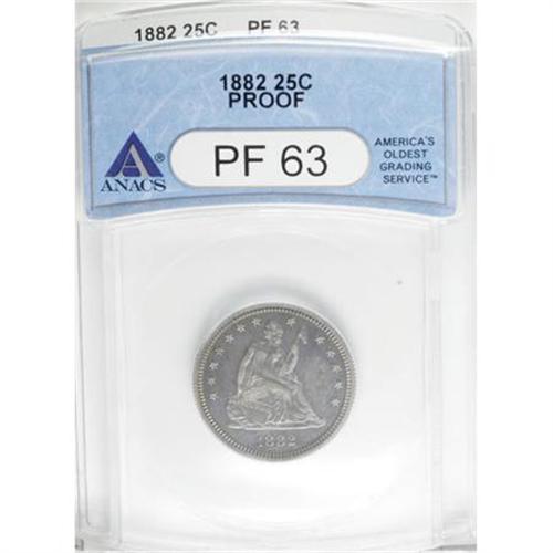 <B>1882 25C PR63 ANACS.</B></I> NGC Census: (39/161). PCGS Population (56/138). Mintage: 1,100. Numismedia Wsl. Price for NGC/PCGS coin in PR63: $565. (#5583)<BR><BR><B>Coin Engraver:</B> Christian Gobrecht<BR><BR><b>Shipping:</b> Coins & Currency (<a target="_blank" href="http://www.heritageauctions.com/common/shipping.php">view shipping information</a>\)