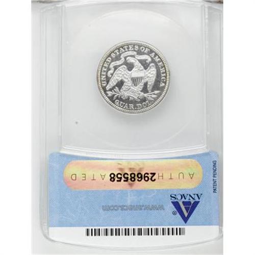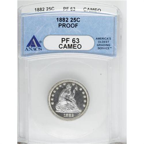 <B>1882 25C PR63 Cameo ANACS.</B></I> This later Seated proof quarter is flashy and deeply reflective with distinct contrast and only a trace of silver-gray patina in the obverse fields. Decisively struck with an especially pleasing cameo effect on the lightly hairlined reverse.<BR><BR><b>Shipping:</b> Coins & Currency (<a target="_blank" href="http://www.heritageauctions.com/common/shipping.php">view shipping information</a>)
