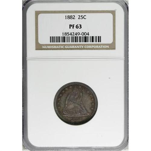 <B>1882 25C PR63 NGC.</B></I> NGC Census: (39/161). PCGS Population (56/138). Mintage: 1,100. Numismedia Wsl. Price for NGC/PCGS coin in PR63: $565. (#5583)<BR><BR><B>Coin Engraver:</B> Christian Gobrecht<BR><BR><b>Shipping:</b> Coins & Currency (<a target="_blank" href="http://www.heritageauctions.com/common/shipping.php">view shipping information</a>\)