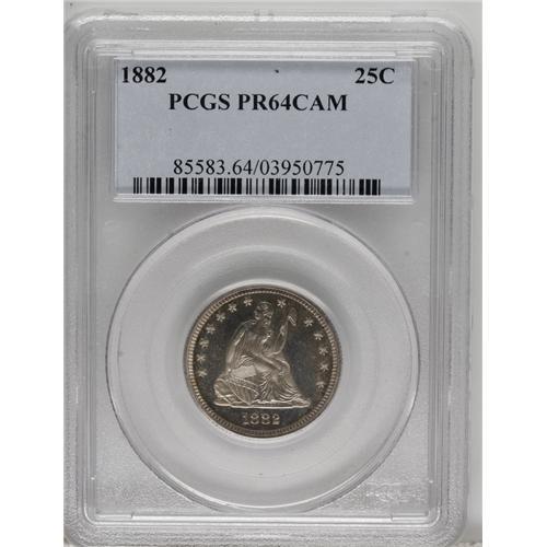 <B>1882 25C PR64 Cameo PCGS.</B></I> This needle-sharp Choice Cameo proof has lovely honey-gold and sky-blue patina. The left obverse field is slightly cloudy. A popular low mintage date. Population: 8 in 64 Cameo, 23 finer (2/07).<BR><BR><b>Shipping:</b> Coins & Currency (<a target="_blank" href="http://www.heritageauctions.com/common/shipping.php">view shipping information</a>)