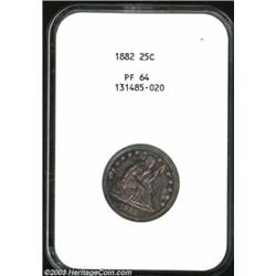 <TABLE cellSpacing=0 cellPadding=0 width="100%" bgColor=#000000 border=0><TBODY><TR><TD width="100%"><TABLE cellSpacing=1 cellPadding=3 width="100%" border=0><TBODY><TR><TD width="100%" bgColor=#79735c><FONT face=arial color=#ffffff size=3><B>Description</B> </FONT></TD></TR><TR><TD width="100%" bgColor=#ffffff><FONT face=arial size=2><B>1882 25C PR64 NGC.</B></I> Radiant electric-blue, peach, and mauve patina embraces this exquisitely struck example. Between proofs and business strikes, only 16,300 pieces were produced. A faint handling mark reaches the final A in AMERICA, although the surfaces are otherwise as made. </FONT></TD></TR></TBODY></TABLE></TD></TR></TBODY></TABLE><BR><A name=PricesRealized></A><TABLE cellSpacing=0 cellPadding=0 width="100%" bgColor=#000000 border=0><TBODY><TR><TD width="100%"><TABLE cellSpacing=1 cellPadding=3 width="100%" border=0><TBODY><TR><TD width="100%" bgColor=#79735c><A name=PR><FONT face=arial color=#ffffff size=3><B>Previous Prices from Heritage Auctions</B> </FONT></A></TD></TR><TR><TD bgColor=#f6f6ed><TABLE cellSpacing=0 cellPadding=0 width="100%" border=1><TBODY><TR><TD align=middle width="33%"><B>Date</B></TD><TD align=middle width="33%"><B>Service</B></TD><TD align=middle width="33%"><B>Price</B></TD></TR><TR bgColor=whitesmoke><TD width="33%"><B>07/10/2001</B></TD><TD width="33%">PCGS</TD><TD width="33%">$525.00</TD></TR><TR bgColor=whitesmoke><TD width="33%"><B>03/12/1993</B></TD><TD width="33%">PCGS</TD><TD width="33%">$1,430.00</TD></TR><TR bgColor=whitesmoke><TD width="33%"><B>06/04/1993</B></TD><TD width="33%">PCGS</TD><TD width="33%">$1,072.50</TD></TR><TR bgColor=whitesmoke><TD width="33%"><B>03/01/2000</B></TD><TD width="33%">PCGS</TD><TD width="33%">$719.00</TD></TR><TR bgColor=whitesmoke><TD width="33%"><B>09/01/1995</B></TD><TD width="33%">PCGS</TD><TD width="33%">$825.00</TD></TR><TR bgColor=whitesmoke><TD width="33%"><B>01/08/2002</B></TD><TD width="33%">NGC</TD><TD width="33%">$661.25</TD></TR><TR bgColor=whitesmoke><TD width="33%"><B>01/04/1995</B></TD><TD width="33%">NGC</TD><TD width="33%">$825.00</TD></TR><TR bgColor=whitesmoke><TD width="33%"><B>06/01/1996</B></TD><TD width="33%">ANACS</TD><TD width="33%">$715.00</TD></TR></TBODY></TABLE></TD></TR><TR><TD bgColor=#ffffff><FONT face=arial size=1 ?>PLEASE NOTE: All prices realized reflect the final hammer price PLUS the buyer's premium in auctions that charge a buyer's premium. Each item has a notation at the top of the listing indicating whether that lot included a buyer's premium. Example: A item that sells with a final hammer price of $100 and a 20% buyer's premium will display with a price realized of $120. All information listed is intended to be as accurate as possible, but errors are possible. Please use this guide carefully and inform us of any inaccuracies. </FONT></TD></TR></TBODY></TABLE></TD></TR></TBODY></TABLE><BR><TABLE cellSpacing=0 cellPadding=0 width="100%" bgColor=#000000 border=0><TBODY><TR><TD width="100%"><TABLE cellSpacing=1 cellPadding=3 width="100%" border=0><TBODY><TR><TD width="100%" bgColor=#79735c colSpan=6><FONT face=arial color=#ffffff size=3><B>Price Guide*</B> </FONT></TD></TR><TR bgColor=#f6f6ed><TD align=middle><B>Grade</B> </TD><TD align=middle><B>Coin World<BR>(Trends)</B> </TD><TD align=middle><B>Numismedia<BR>Retail</B> </TD><TD align=middle><B>Numismedia<BR>Wholesale</B> </TD><TD align=middle><B>Coin<BR>Universe</B> </TD><TD align=middle><B>Heritage<BR>Value Index</B> </TD></TR><TR bgColor=#ffffff><TD align=middle>63</TD><TD align=right>---</TD><TD align=right>$710.00</TD><TD align=right>$565.00</TD><TD align=right>$625.00</TD><TD align=right>$431.67</TD></TR><TR style="FONT-WEIGHT: bold" bgColor=#cccfdd><TD align=middle>64</TD><TD align=right>---</TD><TD align=right>$970.00</TD><TD align=right>$775.00</TD><TD align=right>$910.00</TD><TD align=right>$613.33</TD></TR><TR bgColor=#ffffff><TD align=middle>65</TD><TD align=right>---</TD><TD align=right>---</TD><TD align=right>$1,375.00</TD><TD align=right>$2,200.00</TD><TD align=right>$1,276.33</TD></TR><TR bgColor=#ffffff><TD colSpan=6><FONT size=1>*All information listed is intended to be as accurate as possible, but errors are possible. No item may be returned or refused based on this information which is provided as a service to our customers. You should contact each pricing source directly to determine the accuracy of this information. </FONT></TD></TR></TBODY></TABLE></TD></TR></TBODY></TABLE><BR><TABLE cellSpacing=0 cellPadding=0 width="100%" bgColor=#000000 border=0><TBODY><TR><TD width="100%"><TABLE cellSpacing=1 cellPadding=3 width="100%" border=0><TBODY><TR><TD width="100%" bgColor=#79735c><FONT face=arial color=#ffffff size=3><B>Population Guide</B> </FONT></TD></TR><TR bgColor=#ffffff><TD align=middle><!-- Begin Output of Population Grid--><TABLE cellSpacing=0 cellPadding=0 width="100%" border=0><TBODY><TR><TD vAlign=center><TABLE cellSpacing=0 width="100%" border=1 cellsadding="3"><TBODY><TR><TD vAlign=center><TABLE cellSpacing=0 cellPadding=3 width="100%" border=1><TBODY><TR><TD vAlign=center align=middle bgColor=#f0f1e8 colSpan=2 <CENTER><FONT face=Arial size=2><B>PCGS Pop </B></FONT><CENTER></CENTER></TD><TD vAlign=center align=middle bgColor=#f0f1e8 colSpan=2><CENTER><FONT face=Arial size=2><B>NGC Pop</B></CENTER></FONT></TD></TR><TR><TD vAlign=center><FONT face=Arial size=2>(64)</FONT> </TD><TD vAlign=center align=right><FONT face=Arial size=2>76</FONT> </TD><TD vAlign=center><FONT face=Arial size=2>(64)</FONT> </TD><TD vAlign=center align=right><FONT face=Arial size=2>65</FONT> </TD></TR><TR><TD vAlign=center><FONT face=Arial size=2>(>64)</FONT> </TD><TD vAlign=center align=right><FONT face=Arial size=2>55</FONT> </TD><TD vAlign=center><FONT face=Arial size=2>(>64)</FONT> </TD><TD vAlign=center align=right><FONT face=Arial size=2>75</FONT> </TD></TR></TBODY></TABLE></TD></TR></TBODY></TABLE></TD></TR></TBODY></TABLE><!-- End Output of Population Grid--> Important notice: