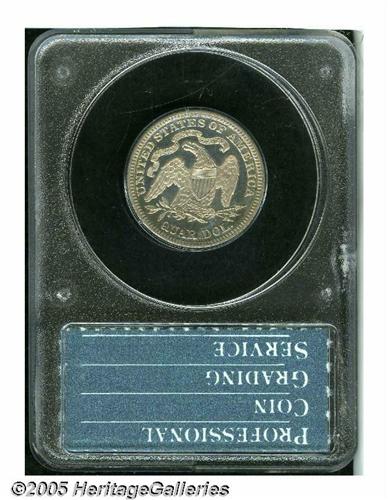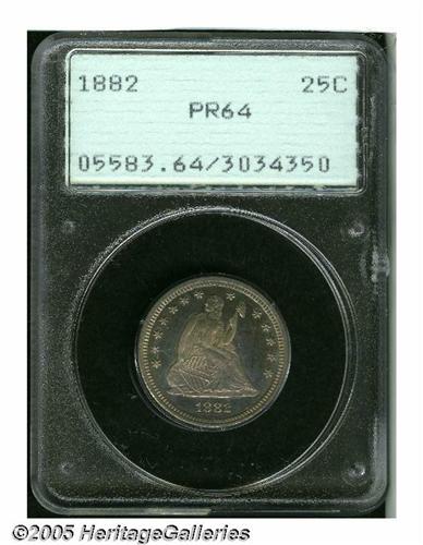 <B>1882<25C> PR64 PCGS.</B></I> Bright flashy proof fields sit beneath plum color that contrasts well with the rosy frosted devices. Well preserved, and housed in an older-style green label PCGS holder.