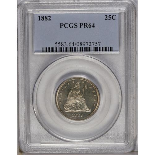 <B>1882<25C> PR64 PCGS.</B></I> Sharply struck with watery fields and mildly frosted devices. Lovely plum, antique-gold, and charcoal-gray toning adorns each side. The carefully preserved surfaces are contact-free, with a few stray hairlines that prevent the Gem grade assessment. Population: 82 in 64, 56 finer (7/06).