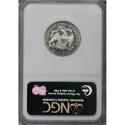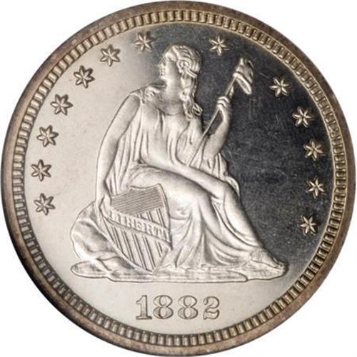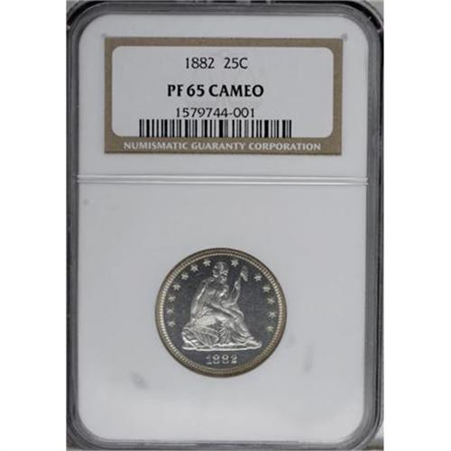 <B>1882 25C PR65 Cameo NGC.</B></I> A powerful Gem with very nearly untoned surfaces displaying great cameo contrast separating the frosty devices from the reflective fields. Magnification reveals some light hairlines, but no offensive contact marks. Of the original proof mintage of 1,100 pieces, NGC and PCGS have graded surprisingly few Cameo examples. Census: 6 in 65 in Cameo, 15 finer (11/07).<BR><BR><b>Shipping:</b> Coins & Currency (<a target="_blank" href="http://www.heritageauctions.com/common/shipping.php">view shipping information</a>)