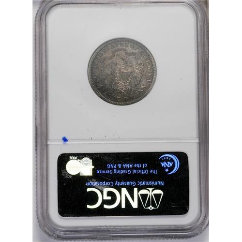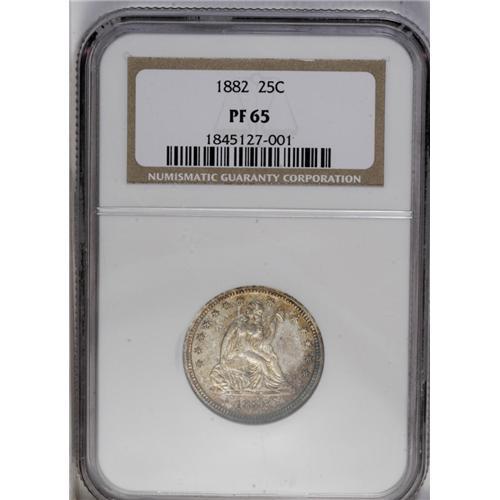 <B>1882<25C> PR65 NGC.</B></I> Most of the obverse is marked by thin russet and violet toning in the watery fields and contrasting ivory devices. From 3 to 7 o'clock on the obverse and on the whole of the reverse, the thicker patina contains brown, red, and red-violet.