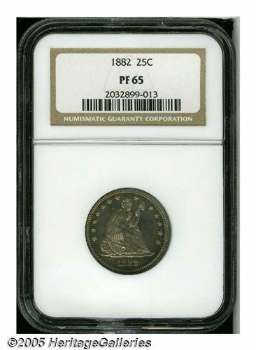 <B>1882<25C> PR65 NGC.</B></I> Sharply struck and well preserved, with vivid golden-brown, crimson, and electric-blue iridescence decorating both sides, along with mildly frosted central devices. A lovely, deeply toned Gem.