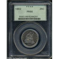 <table><tr><td><TABLE cellSpacing=0 cellPadding=0 width="100%" bgColor=#000000 border=0><TBODY> <TR><TD width="100%"><TABLE cellSpacing=1 cellPadding=3 width="100%" border=0><TBODY><TR><TD width="100%" bgColor=#79735c><FONT face=arial color=#ffffff size=3><B>Description</B> </FONT></TD></TR><TR><TD width="100%" bgColor=#ffffff><FONT face=arial size=2><B>1882 25C PR66 PCGS.</B></I> Of the 16,300 quarters struck in this year, only 1,100 were proofs. The fields are deeply reflective and give the surfaces more vibrancy and life than they might otherwise have. The obverse is toned in subdued shades of blue and violet, while the reverse has an irregularly-shaped crimson center with cobalt-blue around the margin. Population: 15 in 66, 8 finer (9/03). </FONT></TD></TR></TBODY></TABLE></TD></TR></TBODY></TABLE><BR><A name=PricesRealized></A><TABLE cellSpacing=0 cellPadding=0 width="100%" bgColor=#000000 border=0><TBODY><TR><TD width="100%"><TABLE cellSpacing=1 cellPadding=3 width="100%" border=0><TBODY><TR><TD width="100%" bgColor=#79735c><A name=PR><FONT face=arial color=#ffffff size=3><B>Previous Prices from Heritage Auctions</B> </FONT></A></TD></TR><TR><TD bgColor=#f6f6ed><TABLE cellSpacing=0 cellPadding=0 width="100%" border=1><TBODY><TR><TD align=middle width="33%"><B>Date</B></TD><TD align=middle width="33%"><B>Service</B></TD><TD align=middle width="33%"><B>Price</B></TD></TR><TR bgColor=whitesmoke><TD width="33%"><B>08/07/2000</B></TD><TD width="33%">NGC</TD><TD width="33%">$2,185.00</TD></TR><TR bgColor=whitesmoke><TD width="33%"><B>11/01/1999</B></TD><TD width="33%">NGC</TD><TD width="33%">$2,300.00</TD></TR><TR bgColor=whitesmoke><TD width="33%"><B>07/01/1997</B></TD><TD width="33%">PCGS</TD><TD width="33%">$2,090.00</TD></TR><TR bgColor=whitesmoke><TD width="33%"><B>03/01/2000</B></TD><TD width="33%">PCGS</TD><TD width="33%">$2,415.00</TD></TR></TBODY></TABLE></TD></TR><TR><TD bgColor=#ffffff><FONT face=arial size=1 ?>PLEASE NOTE: All prices realized reflect the final hammer price PLUS the buyer's premium in auctions that charge a buyer's premium. Each item has a notation at the top of the listing indicating whether that lot included a buyer's premium. Example: A item that sells with a final hammer price of $100 and a 20% buyer's premium will display with a price realized of $120. All information listed is intended to be as accurate as possible, but errors are possible. Please use this guide carefully and inform us of any inaccuracies. </FONT></TD></TR></TBODY></TABLE></TD></TR></TBODY></TABLE><BR><TABLE cellSpacing=0 cellPadding=0 width="100%" bgColor=#000000 border=0><TBODY><TR><TD width="100%"><TABLE cellSpacing=1 cellPadding=3 width="100%" border=0><TBODY><TR><TD width="100%" bgColor=#79735c colSpan=6><FONT face=arial color=#ffffff size=3><B>Price Guide*</B> </FONT></TD></TR><TR bgColor=#f6f6ed><TD align=middle><B>Grade</B> </TD><TD align=middle><B>Coin World<BR>(Trends)</B> </TD><TD align=middle><B>Numismedia<BR>Retail</B> </TD><TD align=middle><B>Numismedia<BR>Wholesale</B> </TD><TD align=middle><B>Coin<BR>Universe</B> </TD><TD align=middle><B>Heritage<BR>Value Index</B> </TD></TR><TR bgColor=#ffffff><TD align=middle>65</TD><TD align=right>---</TD><TD align=right>---</TD><TD align=right>$1,375.00</TD><TD align=right>$2,200.00</TD><TD align=right>$1,276.33</TD></TR><TR style="FONT-WEIGHT: bold" bgColor=#cccfdd><TD align=middle>66</TD><TD align=right>---</TD><TD align=right>---</TD><TD align=right>$2,375.00</TD><TD align=right>$3,750.00</TD><TD align=right>$2,662.50</TD></TR><TR bgColor=#ffffff><TD align=middle>67</TD><TD align=right>---</TD><TD align=right>---</TD><TD align=right>$5,650.00</TD><TD align=right>$6,600.00</TD><TD align=right>$4,310.00</TD></TR><TR bgColor=#ffffff><TD colSpan=6><FONT size=1>*All information listed is intended to be as accurate as possible, but errors are possible. No item may be returned or refused based on this information which is provided as a service to our customers. You should contact each pricing source directly to determine the accuracy of this information. </FONT></TD></TR></TBODY></TABLE></TD></TR></TBODY></TABLE><BR><TABLE cellSpacing=0 cellPadding=0 width="100%" bgColor=#000000 border=0><TBODY><TR><TD width="100%"><TABLE cellSpacing=1 cellPadding=3 width="100%" border=0><TBODY><TR><TD width="100%" bgColor=#79735c><FONT face=arial color=#ffffff size=3><B>Population Guide</B> </FONT></TD></TR><TR bgColor=#ffffff><TD align=middle><!-- Begin Output of Population Grid--><TABLE cellSpacing=0 cellPadding=0 width="100%" border=0><TBODY><TR><TD vAlign=center><TABLE cellSpacing=0 width="100%" border=1 cellsadding="3"><TBODY><TR><TD vAlign=center><TABLE cellSpacing=0 cellPadding=3 width="100%" border=1><TBODY><TR><TD vAlign=center align=middle bgColor=#f0f1e8 colSpan=2 <CENTER><FONT face=Arial size=2><B>PCGS Pop </B></FONT><CENTER></CENTER></TD><TD vAlign=center align=middle bgColor=#f0f1e8 colSpan=2><CENTER><FONT face=Arial size=2><B>NGC Pop</B></CENTER></FONT></TD></TR><TR><TD vAlign=center><FONT face=Arial size=2>(66)</FONT> </TD><TD vAlign=center align=right><FONT face=Arial size=2>15</FONT> </TD><TD vAlign=center><FONT face=Arial size=2>(66)</FONT> </TD><TD vAlign=center align=right><FONT face=Arial size=2>31</FONT> </TD></TR><TR><TD vAlign=center><FONT face=Arial size=2>(>66)</FONT> </TD><TD vAlign=center align=right><FONT face=Arial size=2>9</FONT> </TD><TD vAlign=center><FONT face=Arial size=2>(>66)</FONT> </TD><TD vAlign=center align=right><FONT face=Arial size=2>11</FONT> </TD></TR></TBODY></TABLE></TD></TR></TBODY></TABLE></TD></TR></TBODY></TABLE><!-- End Output of Population Grid--></TD></TR></TBODY></TABLE></TD></TR></TBODY></TABLE><BR><TABLE cellSpacing=0 cellPadding=0 width="100%" bgColor=#000000 border=0><TBODY><TR> Important notice: Heritage usually auctions material at the rate of 200-250 lots per hour. On some occasions eBay Live bid software or the Internet may not be able to keep up with the pace of the auction. We recommend p