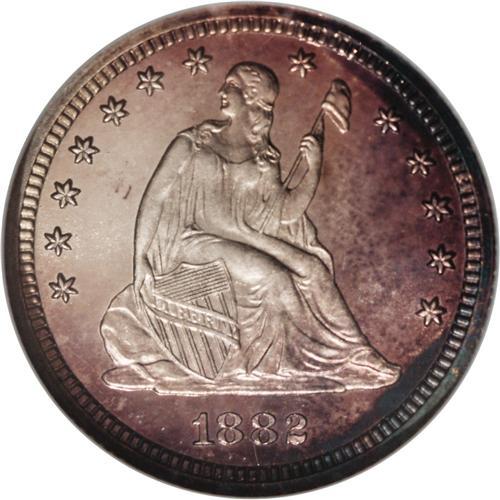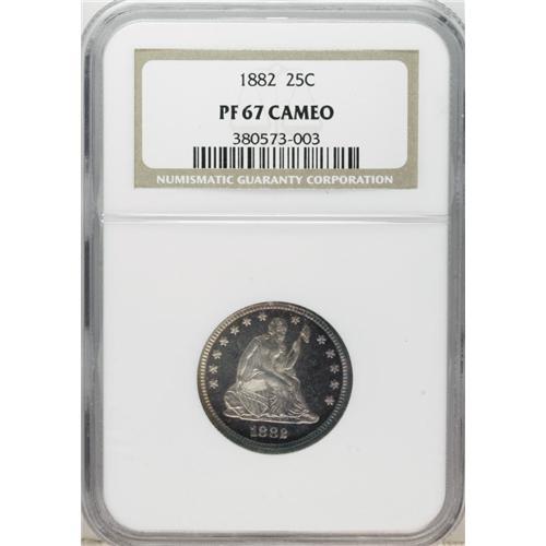 <B>1882 25C PR67 Cameo NGC.</B></I> Rich lilac and wheat-gold grace the fields of this splendid Superb Gem. Cobalt-blue blushes intermittently adorn the margins. There is not a single ill-defined feature, nor can we find a hairline, contact mark, or any other blemish of note. Population: 2 in 67 Cameo, 0 finer (1/07).<BR><BR><b>Shipping:</b> Coins & Currency (<a target="_blank" href="http://www.heritageauctions.com/common/shipping.php">view shipping information</a>)