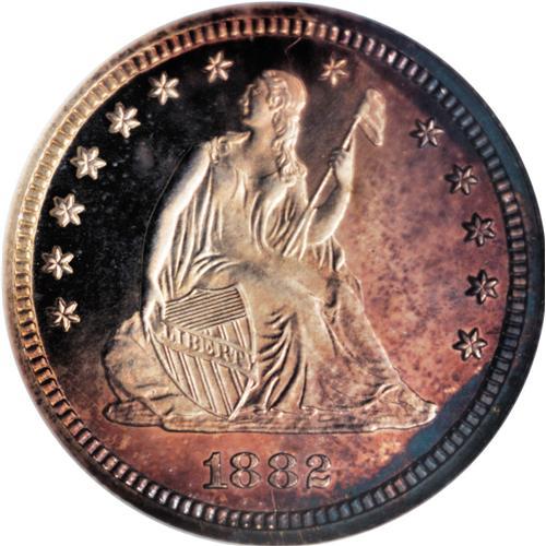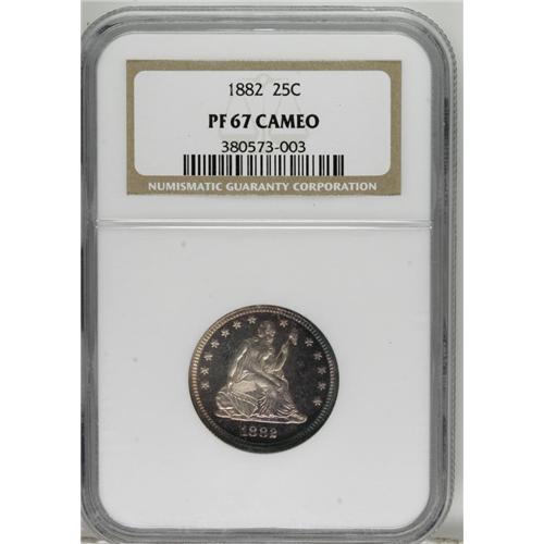 <B>1882 25C PR67 Cameo NGC.</B></I> Rich lilac and wheat-gold grace the fields of this splendid Superb Gem. Cobalt-blue blushes intermittently adorn the margins. There is not a single ill-defined feature, nor can we find a hairline, contact mark, or any other blemish of note. Population: 2 in 67 Cameo, 0 finer (4/07).<BR><BR><b>Shipping:</b> Coins & Currency (<a target="_blank" href="http://www.heritageauctions.com/common/shipping.php">view shipping information</a>)