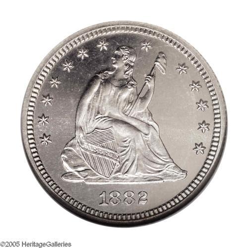 <B>1882<25C> PR67 Cameo NGC.</B></I> With such a limited original mintage (15,200 business strikes and 1,100 proofs), it is little wonder that the Philadelphia mint used only two sets of dies for the 1882 Seated Liberty Quarter. The specimen strikings are distinguishable from prooflike Uncs. by the position of the left base of the 2 in the date over the right edge of a denticle. The reverse die that the mint employed for the proof 1882 is not new--it had been used to deliver the 975 proof Quarters of the previous year.<BR> A glorious Superb Gem, the surfaces present as completely brilliant, although a hint of milky color is seen as the coin rotates under a light. There is not a single ill-defined feature, nor can we find a hairline, contact mark, or any other blemish of note. A solidly graded and conditionally rare Superb Gem. Census: 6 in 67 Cameo, none are finer (10/05).