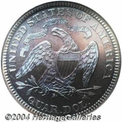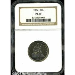 <B>1882<25C> PR67 NGC.</B></I> This resplendent Superb Gem is draped in soft blue-gray toning over the obverse, the reverse is predominately cobalt-blue with deep crimson at the central portion as the coin is turned under a light. Pleasing reflectivity is seen in the fields at most angles, the reverse exhibits considerable mint frost over the eagle. A distraction-free representative whose impressive originality will elicit high bids from Seated Quarter specialists. <BR><BR><B>Important notice:</B> Heritage usually auctions material at the rate of 200-250 lots per hour. On some occasions eBay Live bid software or the Internet may not be able to keep up with the pace of the auction. We recommend placing a realistic absentee bid now as insurance to avoid disappointment. Occasionally the auctioneer may eliminate or reject an eBay Live bid, and the auctioneer may also reopen a lot after the close of the eBay live bidding (usually because we missed an audience bid), and may reject your bid even if it shows you as the winning bidder. By bidding via eBay Live, you agree that Heritage may award the lot to another bidder at its sole discretion under the circumstances described above or any other reasonable circumstances. Since eBay bids are not shown to us until we open the lot on the floor, we treat those bids just like floor bids. In most cases the floor responds before the eBay bid is presented to us, due to Internet lag time, so for consistency we have made it a policy that floor bids are always considered first over tie eBay live bids. Also please note that all Heritage lots purchased through eBay Live carry a 20% Buyer's Premium. Please make sure you read the Terms and Conditions before you bid. </span></font></tr></table></td></tr></table>