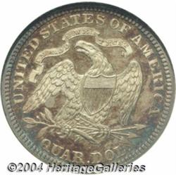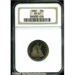 <B>1882<25C> PR67 NGC.</B></I> Noticeably cameoed with reddish-gold and cobalt-blue iridescence that lightens a bit more at the center of the reverse and allows a greater appreciation of the intense frostiness of the eagle. Not only one of the finest, but also one of the more colorful examples of this popular proof issue we have yet offered. Population: 12 in 67, 0 finer (6/04).<BR><I>Ex: Central States Signature Sale (Heritage, 5/00), lot 7319, which realized $4,485.</B></I><BR><I>From the JFS Collection.</B></I> <BR><BR><B>Important notice:</B> Heritage usually auctions material at the rate of 200-250 lots per hour. On some occasions eBay Live bid software or the Internet may not be able to keep up with the pace of the auction. We recommend placing a realistic absentee bid now as insurance to avoid disappointment. Occasionally the auctioneer may eliminate or reject an eBay Live bid, and the auctioneer may also reopen a lot after the close of the eBay live bidding (usually because we missed an audience bid), and may reject your bid even if it shows you as the winning bidder. By bidding via eBay Live, you agree that Heritage may award the lot to another bidder at its sole discretion under the circumstances described above or any other reasonable circumstances. Since eBay bids are not shown to us until we open the lot on the floor, we treat those bids just like floor bids. In most cases the floor responds before the eBay bid is presented to us, due to Internet lag time, so for consistency we have made it a policy that floor bids are always considered first over tie eBay live bids. Also please note that all Heritage lots purchased through eBay Live carry a 20% Buyer's Premium. Please make sure you read the Terms and Conditions before you bid. </span></font></tr></table></td></tr></table>