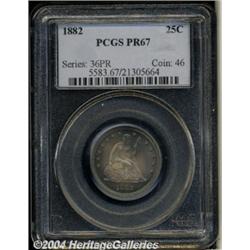 <B>1882<25C> PR67 PCGS.</B></I> Briggs 2-B. The deeply reflective fields sparkle under a moderate coating of natural cobalt-blue toning. The obverse is somewhat lighter with magenta-gray colors seen primarily at the central portion. All of the design features are well struck, and the surfaces are near-pristine overall. A few marks on the PCGS plastic holder should not be confused with surface problems on this specimen. An appealing Superb Gem example, carefully preserved with excellent eye appeal. Population: 9 in 67, 0 finer (3/04).<BR><I>From the JFS Collection.</B></I> <BR><BR><B>Important notice:</B> Heritage usually auctions material at the rate of 200-250 lots per hour. On some occasions eBay Live bid software or the Internet may not be able to keep up with the pace of the auction. We recommend placing a realistic absentee bid now as insurance to avoid disappointment. Occasionally the auctioneer may eliminate or reject an eBay Live bid, and the auctioneer may also reopen a lot after the close of the eBay live bidding (usually because we missed an audience bid), and may reject your bid even if it shows you as the winning bidder. By bidding via eBay Live, you agree that Heritage may award the lot to another bidder at its sole discretion under the circumstances described above or any other reasonable circumstances. Since eBay bids are not shown to us until we open the lot on the floor, we treat those bids just like floor bids. In most cases the floor responds before the eBay bid is presented to us, due to Internet lag time, so for consistency we have made it a policy that floor bids are always considered first over tie eBay live bids. Also please note that all Heritage lots purchased through eBay Live carry a 20% Buyer's Premium. Please make sure you read the Terms and Conditions before you bid. </span></font></tr></table></td></tr></table>
