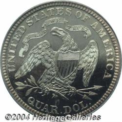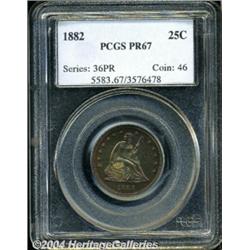 <B>1882<25C> PR67 PCGS.</B></I> Only 16,300 Quarters were struck in 1882, of which 1,100 were proofs, and this is one of the finest examples we have seen in some time. The fields show unfathomable depth of reflectivity on each side that is abundantly evident irrespective of the depth of toning present. On the obverse, the color is a rich crimson-red, deepening to magenta, then subtle green at the border. The reverse is quite different from the obverse with bright turquoise-blue toning changing to lime-golden at the peripheral area. A splendid, high-end Seated Quarter with great eye appeal. Population: 9 in 67, none finer at either service (3/04).<BR><I>From the JFS Collection.</B></I> <BR><BR><B>Important notice:</B> Heritage usually auctions material at the rate of 200-250 lots per hour. On some occasions eBay Live bid software or the Internet may not be able to keep up with the pace of the auction. We recommend placing a realistic absentee bid now as insurance to avoid disappointment. Occasionally the auctioneer may eliminate or reject an eBay Live bid, and the auctioneer may also reopen a lot after the close of the eBay live bidding (usually because we missed an audience bid), and may reject your bid even if it shows you as the winning bidder. By bidding via eBay Live, you agree that Heritage may award the lot to another bidder at its sole discretion under the circumstances described above or any other reasonable circumstances. Since eBay bids are not shown to us until we open the lot on the floor, we treat those bids just like floor bids. In most cases the floor responds before the eBay bid is presented to us, due to Internet lag time, so for consistency we have made it a policy that floor bids are always considered first over tie eBay live bids. Also please note that all Heritage lots purchased through eBay Live carry a 20% Buyer's Premium. Please make sure you read the Terms and Conditions before you bid. </span></font></tr></table></td></tr></table>