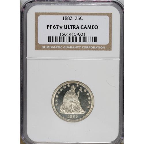 <B>1882 25C PR67 <img border='0' src='http://www.heritagecoins.com/images/star.gif' width=10 height=10> Ultra Cameo NGC.</B></I> This is an amazing proof with incredible eye appeal created by wispy champagne toning over deep mirrored fields and highly lustrous devices. Every individual design element, including the date, stars, and lettering, has intensive silver frost that provides a remarkable black and white appearance. Business strike mintage for this date was quite low, and today proof examples provide the vast majority of high quality pieces for date collectors. A PR68 Cameo example is the single finer proof representative of this date that has been certified by NGC.<BR><BR><b>Shipping:</b> Coins & Currency (<a target="_blank" href="http://www.heritageauctions.com/common/shipping.php">view shipping information</a>)