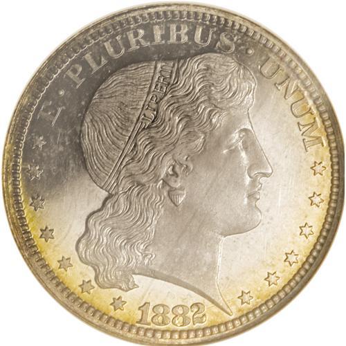 <B>1882 25C Shield Earring Quarter Dollar, Judd-1698, Pollock-1900, Low R.7, PR67 NGC.</B></I> Liberty faces to the right and wears an earring that is shaped and designed like a shield, thus the name for George Morgan's pattern design. The E PLURIBUS UNUM motto is found along the upper obverse border with the date below. The fields have seven stars to the left and six to the right. The reverse has an eagle with raised wings in a defiant pose, holding an olive branch and three arrows. The legend UNITED STATES OF AMERICA is close to the upper reverse border and the denomination QUARTER DOLLAR is below. Struck in silver with a reeded edge. This Superb Gem is an outstanding proof with excellent cameo contrast. Pale gold toning graces the deeply mirrored obverse fields with richer gold, lilac, and iridescent toning on the reverse. This piece easily qualifies for the Cameo designation. At USPatterns.com, Saul Teichman has listed exactly nine examples of this variety that are known to him. The specimen that we are offering here is number six on his list.<BR><I>Ex: Champa Collection (Bowers and Ruddy, 5/1972); Robert Hughes (1/1980); Heritage (10/1999); Superior FPL (4-7/2000)</B></I><BR><I>From The Jones Beach Collection.</B></I><BR><BR><b>Shipping:</b> Coin/Currency (<a target="_blank" href="http://www.heritageauctions.com/common/shipping.php">view shipping information</a>)