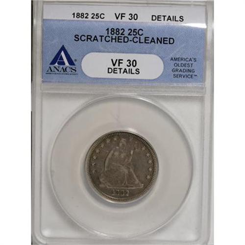 <B>1882 25C --Cleaned, Scratched--ANACS. VF30 Details.</B></I> NGC Census: (0/58). PCGS Population (0/95). Mintage: 15,200. Numismedia Wsl. Price for NGC/PCGS coin in VF30: $278. (#5514)<BR><BR><B>Coin Engraver:</B> Christian Gobrecht<BR><BR><b>Shipping:</b> Coins & Currency (<a target="_blank" href="http://www.heritageauctions.com/common/shipping.php">view shipping information</a>)