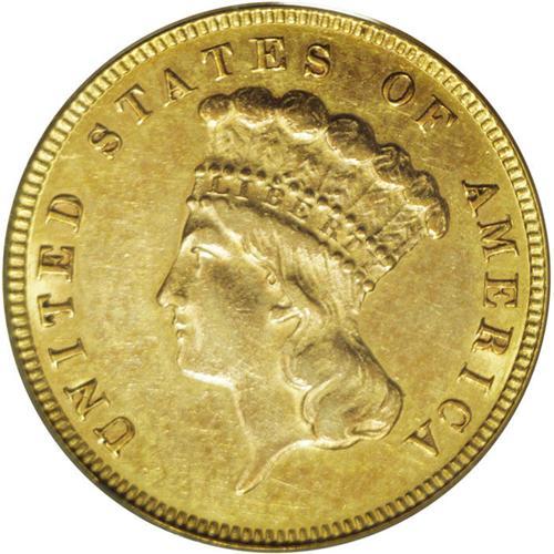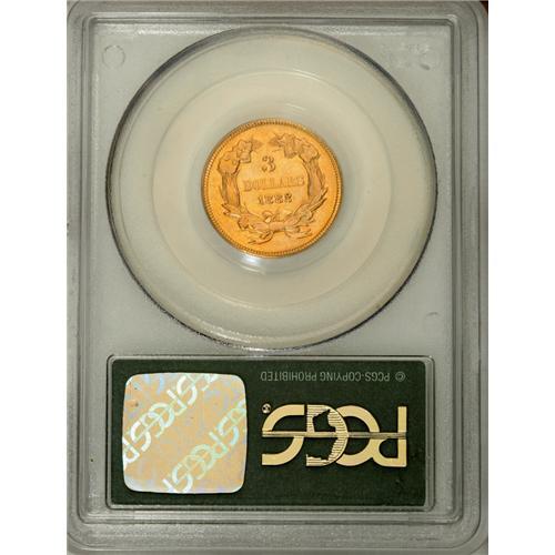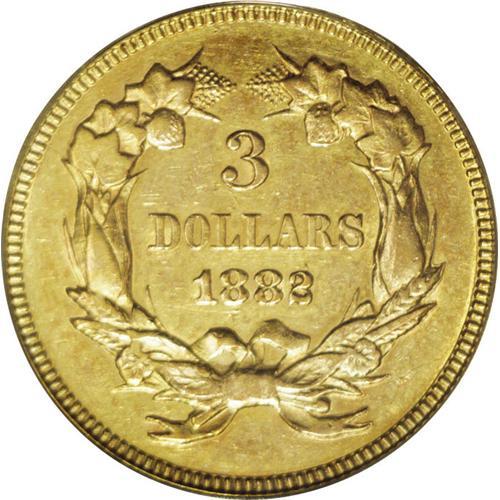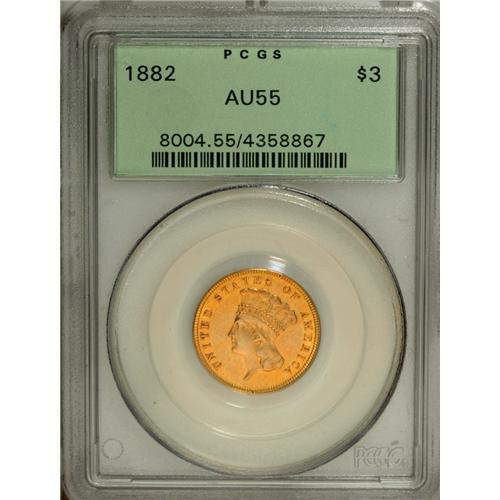<B>1882 $3 AU55 PCGS.</B></I> An attractive, lustrous example of this scarce date, with original orange and rose-gold surfaces and a trace of wear. The fields are highly reflective, and both sides are relatively free of major abrasions. One tiny collision below the first 8 in the date is noted for accuracy. Housed in a second generation PCGS green label holder. From an original mintage of just 1,576 pieces.<BR><I>From The Twin Hollows Collection.</B></I><BR><BR><b>Shipping:</b> Coin/Currency (<a target="_blank" href="http://www.heritageauctions.com/common/shipping.php">view shipping information</a>)