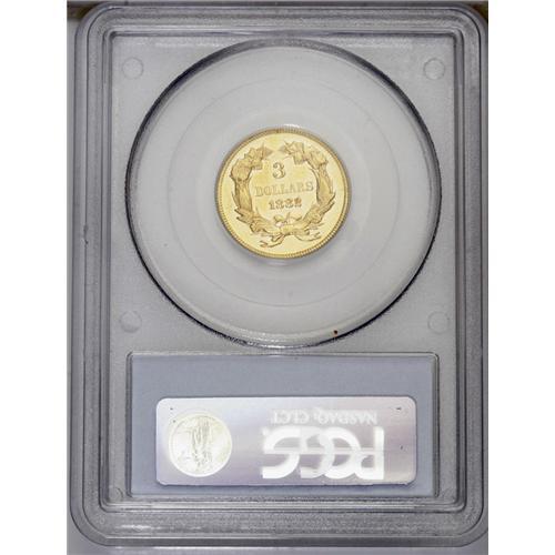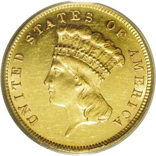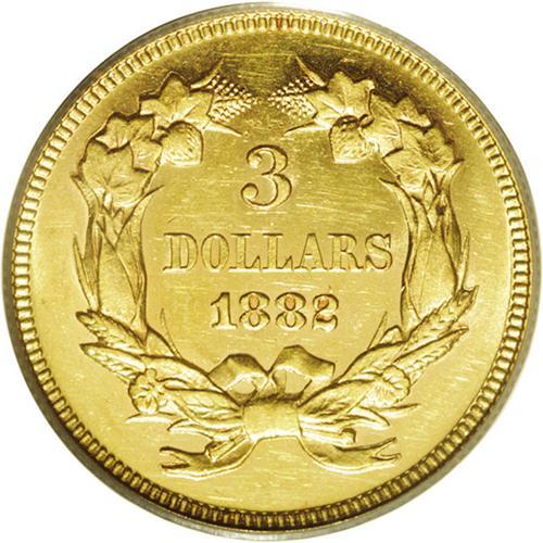 <B>1882<$3> AU58 PCGS.</B></I> At first glance this coin appears to be a proof, not surprising considering the minimal wear on this coin and the scant mintage for the issue of 1,576 pieces, ensuring that most would show prooflike qualities. Under a loupe small abrasions from a brief stint in circulation are evident, along with faint rub on the hair curl just below the I in LIBERTY and in the left obverse field. The reverse shows little wear, but it has a lintmark between the wreath tips and a couple of dotlike planchet indentations. This lovely piece would fit nicely in a Mint State set without apology. <BR><BR><B>Important notice:</B> Heritage usually auctions material at the rate of 200-250 lots per hour. On some occasions eBay Live bid software or the Internet may not be able to keep up with the pace of the auction. We recommend placing a realistic absentee bid now as insurance to avoid disappointment. Occasionally the auctioneer may eliminate or reject an eBay Live bid, and the auctioneer may also reopen a lot after the close of the eBay live bidding (usually because we missed an audience bid), and may reject your bid even if it shows you as the winning bidder. By bidding via eBay Live, you agree that Heritage may award the lot to another bidder at its sole discretion under the circumstances described above or any other reasonable circumstances. Since eBay bids are not shown to us until we open the lot on the floor, we treat those bids just like floor bids. In most cases the floor responds before the eBay bid is presented to us, due to Internet lag time, so for consistency we have made it a policy that floor bids are always considered first over tie eBay live bids. Also please note that all Heritage lots purchased through eBay Live carry a 20% Buyer's Premium. Please make sure you read the Terms and Conditions before you bid. This lot is being auctioned in conjunction with a live floor auction by Heritage Galleries & Auctioneers. All final auction and invoice information will be supplied by Heritage Galleries & Auctioneers, and all other information should be considered preliminary. Lot:2602 <BR><BR><B>Winning Notification and Billing:</B> After the FINAL session in this auction is complete, Heritage will send e-mail and snail mail invoices. This process normally takes several days. All final auction and invoice information will be supplied by Heritage Galleries & Auctioneers, and all other information should be considered preliminary. <BR><BR>This auction will be conducted on a live auction floor and over the Internet through eBay Live. If you choose to place an absentee bid, please take a moment to <font color='#0000ff'><u><a href='http://pages.ebay.com/liveauctions/help/before/laabsentee.html'>learn how eBay Live absentee bidding works</a></u></font><font color='#000000'>