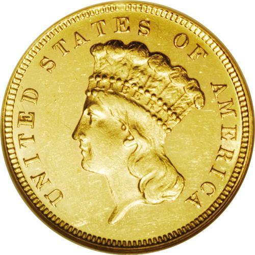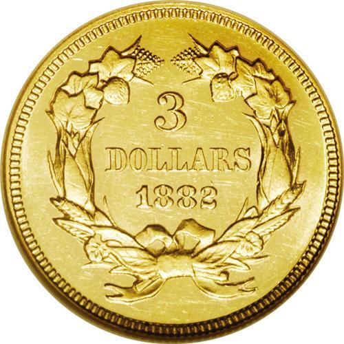 <B>1882<$3> MS61 NGC.</B></I> A fairly number of 1882 threes have survived in Mint State; indeed NGC and PCGS combined have certified about 210 Uncirculated examples, several of which are likely resubmissions. This MS62 coin exhibits bright surfaces with attractive brass-gold patina and decent luster. The fields reveal extensive prooflike tendencies, which is characteristic of the date, and offer considerable contrast to the mildly frosted motifs. A sharp strike characterizes the design elements, with just some minor softness apparent in Liberty's hair. Magnification reveals several wispy slide marks, as well as some short, inoffensive pinscratches. The diagnostic crescent-shaped vestige of an earlier 2 above the final digit shows clearly.