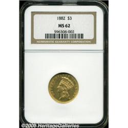 <B>1882 $3 MS62 NGC.</B></I> A scarce low-mintage date with a total production of 1,576 pieces of which perhaps a couple of hundred are known today in all grades. This particular coin retains luster in the fields and a decent strike although the uppermost design elements are a touch weak. We also note a minor nick on Liberty's jaw, visible with a loupe. The 2 in the date is widely recut high, as often seen. One for the date collector. Population: 20 in 62, 34 finer (2/05).