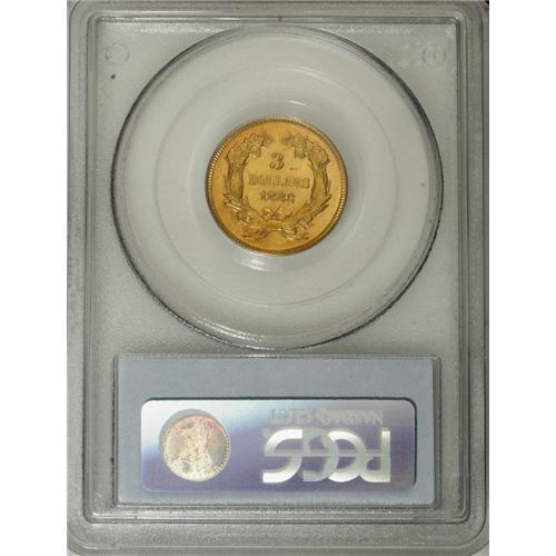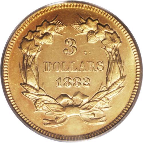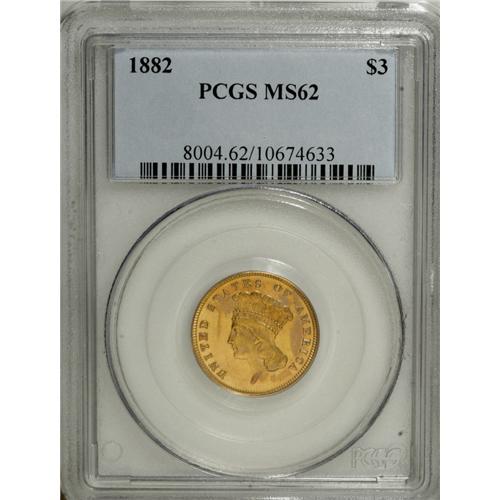 <B>1882 $3 MS62 PCGS.</B></I> Considering the tiny mintage of only 1,500 business strikes plus 76 proofs, it is unsurprising that this piece shows mentionable prooflikeness in the fields on each side, along with moderate mint frost on the devices. A few light ticks in the fields and a bit of blue-gray haze on the obverse contribute to the grade, but the color is a deep, rich sunset-orange, adding further to the appeal.<BR><BR><b>Shipping:</b> Coins & Currency (<a target="_blank" href="http://www.heritageauctions.com/common/shipping.php">view shipping information</a>)