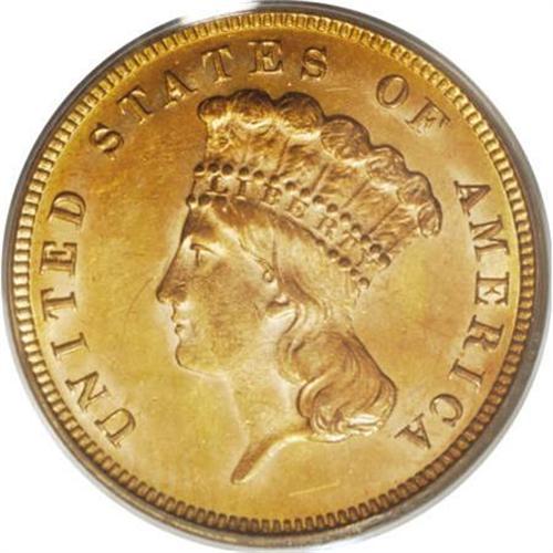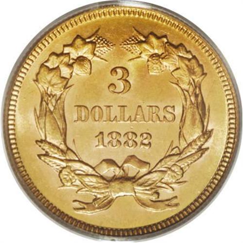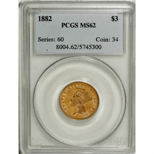 <B>1882 $3 MS62 PCGS.</B></I> Beautiful orange-gold coloration displays occasional hints of lilac, and the surfaces of both sides have prooflike characteristics. All of the design elements are well struck up. A few minute marks define the grade. The 2 in the date is repunched, with a crescent-shaped vestige of an earlier 2 above the final digit. This differentiates Mint State prooflike coins and proofs, as the latter do not have this feature (David Bowers, 2005).<BR><I>From The DAX Collection.</B></I><BR><BR><B>Coin Engraver:</B> James B. Longacre<BR><BR><b>Shipping:</b> Coins & Currency (<a target="_blank" href="http://www.heritageauctions.com/common/shipping.php">view shipping information</a>\)