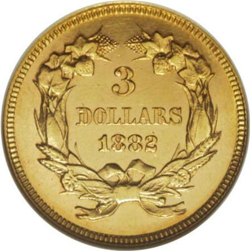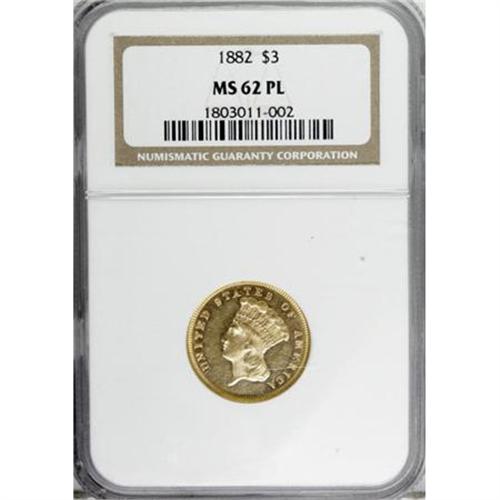 <B>1882 $3 MS62 Prooflike NGC.</B></I> The low-mintage 1882 three dollar piece (1,500 circulation strikes) has a fairly high Mint State survival rate. Few of them are Prooflike, however. Indeed, NGC has seen just 12 such coins, including the MS62 example in this lot. Peach-gold surfaces yield strong motif-field contrast, along with sharply defined devices. Inoffensive handling marks in the fields define the grade. Circulation strikes are differentiated from proofs by a repunched 2 in the date, with the remnants of an earlier 2 above and in the center of the final 2 (David Bowers, 2005). <BR><I>From The Vanek Collection.</B></I><BR><BR><b>Shipping:</b> Coins & Currency (<a target="_blank" href="http://www.heritageauctions.com/common/shipping.php">view shipping information</a>)