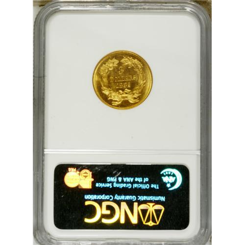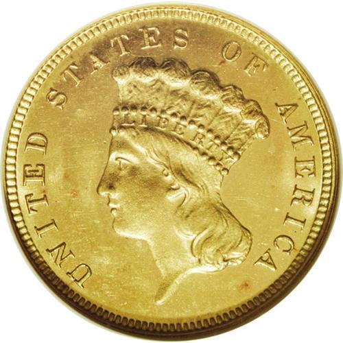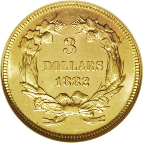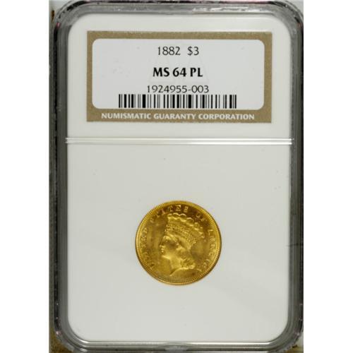 <B>1882 $3 MS64 Prooflike NGC.</B></I> Recut 2 in date. Breen-6396. The digit 2 is sharply recut with the initial position about 50% too high. This is a stunning near-Gem example of a rare, low-mintage issue. Just 1,500 business strikes were coined, alongside 76 proof examples. Mint State survivors are elusive, and prooflike pieces are highly desirable. This coin has fully mirrored fields with lovely greenish yellow-gold color. A few faint abrasions and insignificant copper toning spots keep it from a Gem grade.<BR><BR><b>Shipping:</b> Coins & Currency (<a target="_blank" href="http://www.heritageauctions.com/common/shipping.php">view shipping information</a>)