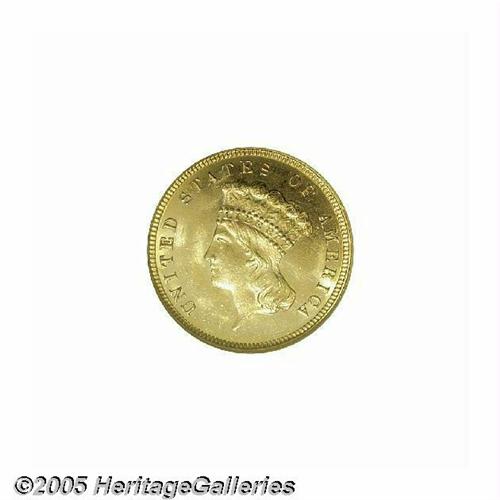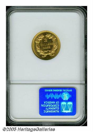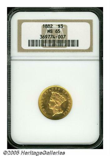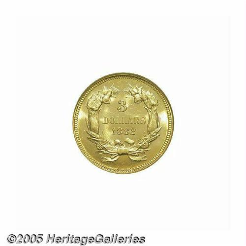 <B>1882<$3> MS65 NGC.</B></I> This Gem coin shows blazing luster throughout, with apparent mint frost on Liberty's head. The strike is very sharp on the uppermost curls of Liberty, and even the finer details of the wreath are present. Curiously the date was widely recut on the 2, with an errant 2 placed well above the horizon line of the other digits. As a date, the 1882 is quite scarce, boasting a meager mintage of 1,500 pieces for circulation. The combined NGC and PCGS Population reports tally seven examples graded this high, and importantly they show a scant seven coins in higher grades. One for the date or type collector who demands Gem quality and exceptional eye appeal for their collection.
