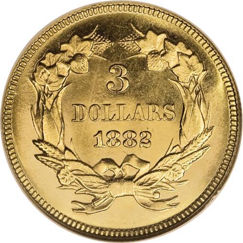 <B>1882 $3 MS65 Prooflike NGC.</B></I> Certain three dollar issues, particularly the 1878, are plentiful in Mint State relative to their cost. No one could say such a thing about the 1882, since only 1,500 business strikes were coined, and probably fewer than 200 pieces have survived in Mint State. Most of those coins grade between MS61 and MS63. Gems are rare, with or without reflective fields. This splendidly preserved example has frosty devices and flashy fields. The centers are pumpkin-gold, while the borders are a lighter yellow-gold. As usual for the 1882, the 2 in the date is widely repunched north. An exemplary Gem that would fit within the finest quality specialized collection. Census: 2 in 65 Prooflike, 1 finer (4/07).<BR><BR><b>Shipping:</b> Coins & Currency (<a target="_blank" href="http://www.heritageauctions.com/common/shipping.php">view shipping information</a>)